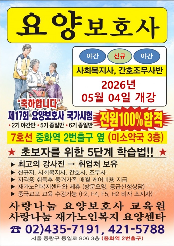 주소 : 서울특별시 중랑구 중화동 285-6 3층 사랑나눔요양보호사교육원ㅣTEL : 02-435-7191 / 02-421-5788ㅣFAX : 02-423-4325